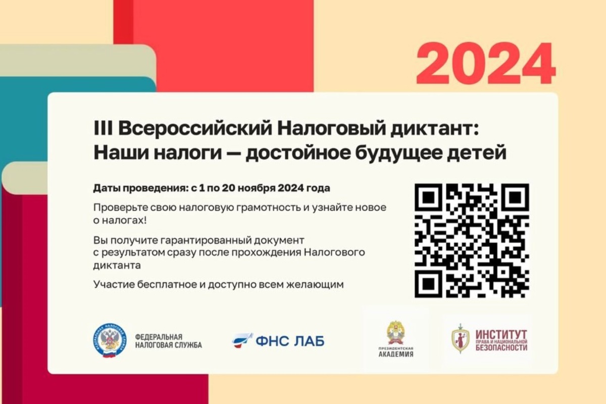 Федеральная налоговая служба и Российская академия народного хозяйства и государственной службы при Президенте Российской Федерации с 1 по 20 ноября 2024 года проводят III Всероссийский налоговый диктант «Наши налоги – достойное будущее детей».
