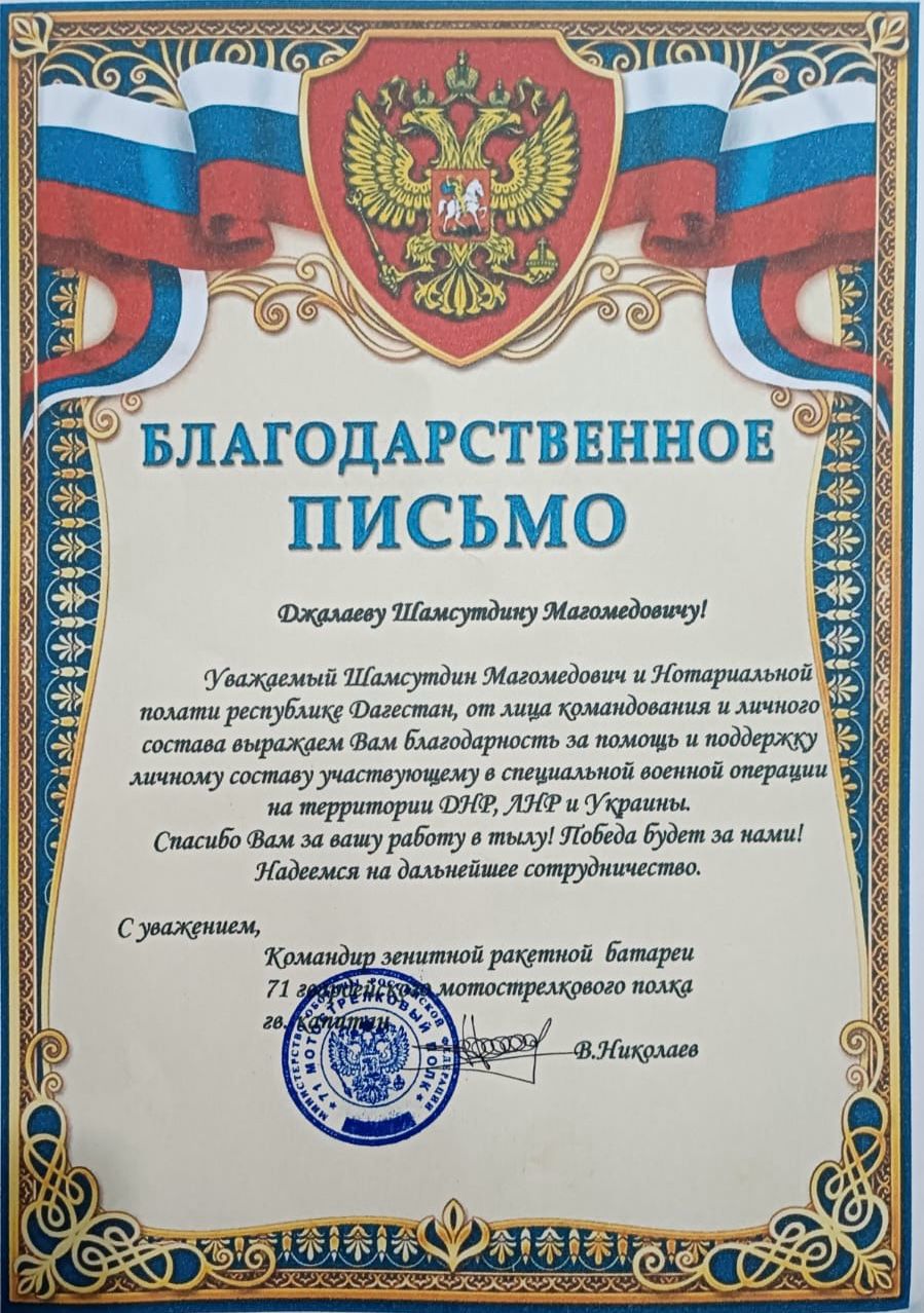 71-й Гвардейский мотострелковый полк в лице командования и личного состава выразил свою искреннюю благодарность Президенту НП РД Шамсутдину Джалаеву и Нотариальной Палате Республики Дагестан за оказанную помощь подразделению, выполняющему боевые задачи в зоне проведения СВО.