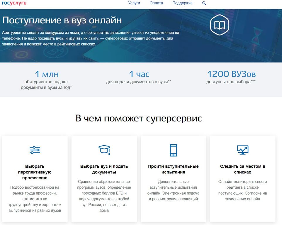 Например, через супер-сервис можно подать заявление для поступления прямо из дома на портале «Госуслуги»: вам не нужно ехать в вуз, стоять в очереди и заполнять бумаги.