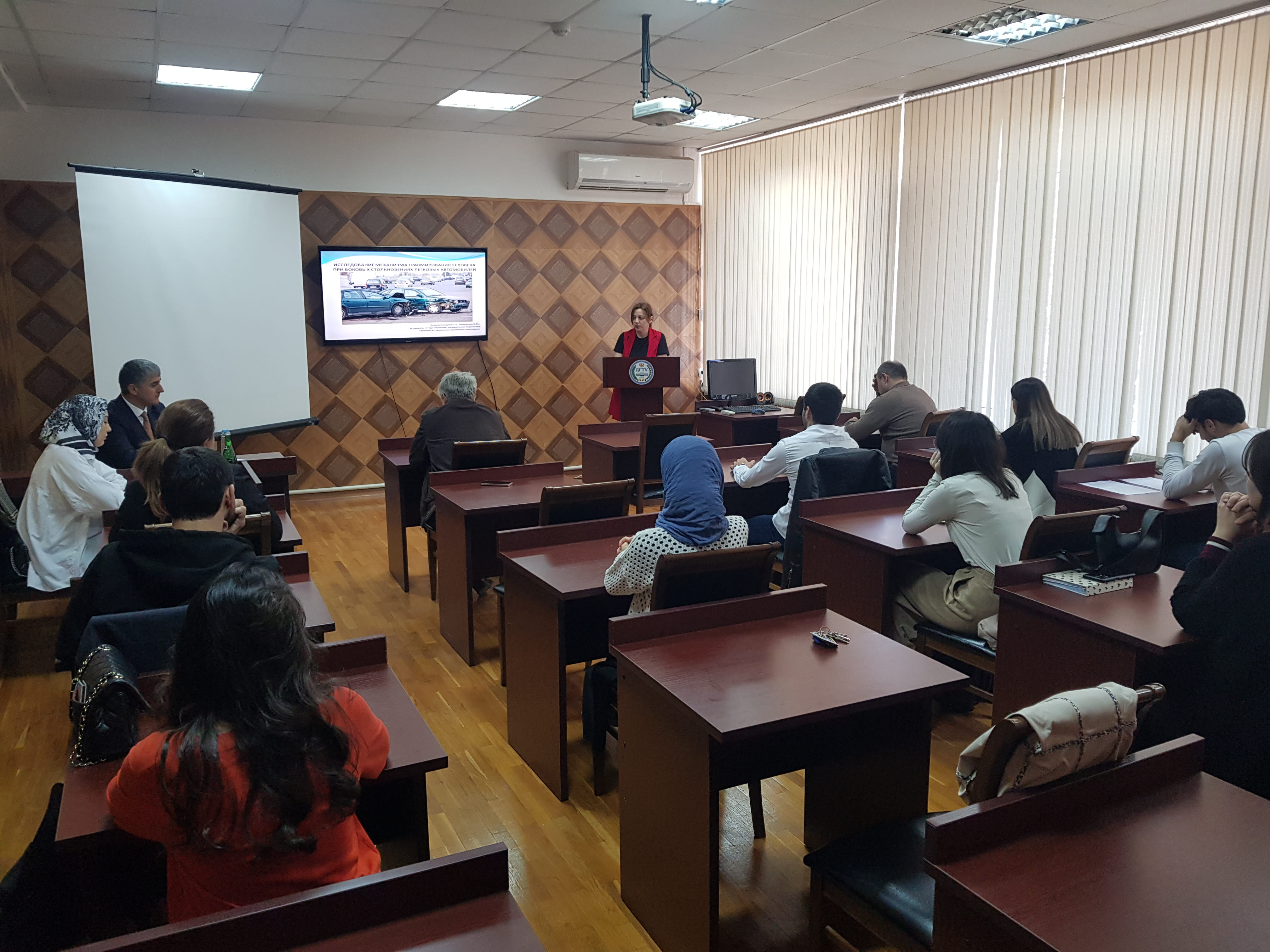 С приветственным словом выступил руководитель секции, декан факультета права и управления на транспорте Эдвард Батманов. Далее с докладом «Исследование механизма травмирования человека при боковых столкновениях легковых автомобилей» выступили аспиранты 2-го года обучения Назиле Алимагомедова и Камилла Батманова, которые отметили, что основой для разработки критериев оценки безопасности конструкции автомобиля и вероятности тр авмирования водителя и пассажиров являются иссле дования биокинематики и б иодинамики ДТП. В своем выступлении аспирант 3-го года обучения Патимат Дадаева привела данные проведенных исследований биомеханики фронтальных столкновений легковых автомобилей и сформулировала основные функциональные требования к элементам системы обеспечения пассивной безопасности. Аспиранты кафедры организации и безопасности движения Зумруд Абдулаева, Наргиза Мирзаханова и Ризван Расулов в своем докладе отметили, что только комплексные исследования могут позволить определить истинные причины ДТП и наметить эффективные мероприятия по повышению безопасности дорожного движения. Провели анализ существующих методов сбора и анализа данных о ДТП. Аспирант 3-го года обучения Марат Шабазов выступил с докладами: «Безопасность и структура дорожного движения» и «Организация движения при проведении дорожных работ».