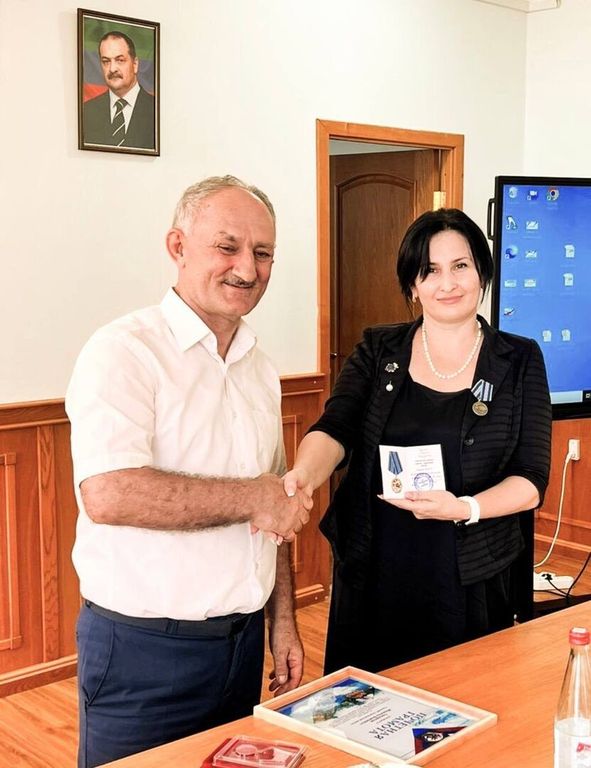 За организацию работы по сбору гуманитарной помощи участникам специальной военной операции Кудаева Светлана Рамазановна, начальник МКУ «Управление образования» МО «Новолакский район», заместитель председателя Союза женщин Новолакского района награждена медалью участника гуманитарного конвоя.