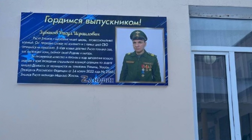 В рамках реализации патриотического проекта «Лица Героев», на фасаде Бабаюртовской СОШ №1 имени Арзулумова разместили баннер, посвященный выпускнику данной школы Расулу Зубакову.