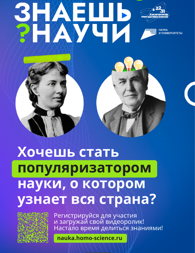 В октябре 2022 года стартовал прием заявок наВсероссийский детский научно-популярный конкурс «Знаешь? Научи!». Конкурс поможет школьникам со всей России попробовать себя в роли научно-популярных блогеров и выиграть сертификаты на образовательные курсы, технику и поездки, а также новое оборудование для школ.