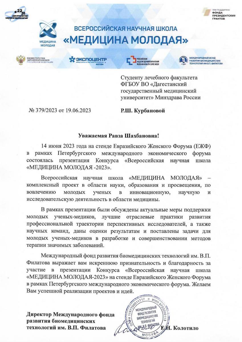 Исмаилов Муслим Исмаилович – главный врач Центра медицины Высоких технологий, д.м.н., профессор, заведующий кафедрой глазных болезней ДГМУ; Рагимов Разин Мирзекеримович – д.м.н., профессор, зав. кафедрой нормальной физиологии ДГМУ; Абдуллаева Наида Муртузалиевна – к.б.н., доцент кафедры нормальной физиологии ДГМУ.Международный фонд развития биомедицинских технологий им. В.П. Филатова выражает искреннюю признательность и благодарность за участие в презентации Конкурса «Всероссийская научная школа «МЕДИЦИНА МОЛОДАЯ-2023» на стенде Евразийского Женского Форума в рамках Петербургского международного экономического форума. Желает успешной реализации проектов и идей.