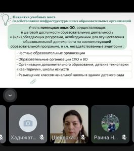 Во исполнение приказа Минобрнауки Республики Дагестан от 03.12.2022 № 204-0 «Об утверждении плана-графика проведения очных встреч, семинаров, вебинаров и других мероприятий в рамках деятельности стажировочной площадки «Ликвидация третьей смены обучения в общеобразовательных организациях» на 2023 год Центром развития общего образования 24 апреля 2023 г. был организован и проведен региональный семинар-совещание по теме «Научно-методическое сопровождение образовательного процесса в условиях риска возникновения режима обучения в третью смену в ОО РД» в онлайн режиме посредством использования образовательной платформы «Сферум».