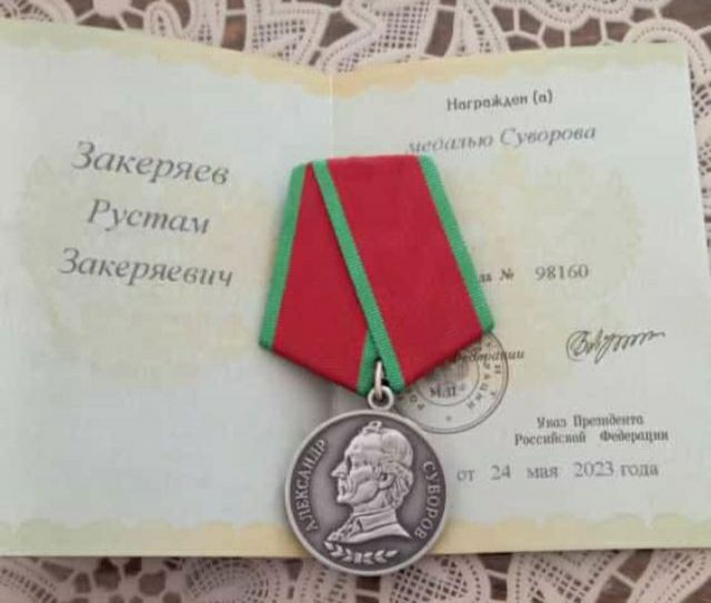 За отвагу и самоотверженность, проявленные при выполнении боевых задач на территории проведения специальной военной операции, дагестанец, уроженец села Усухчай Докузпаринского района Закеряев Рустам Закеряевич, Указом Президента РФ В. Путина от 24 мая 2023 года, награжден медалью Суворова.