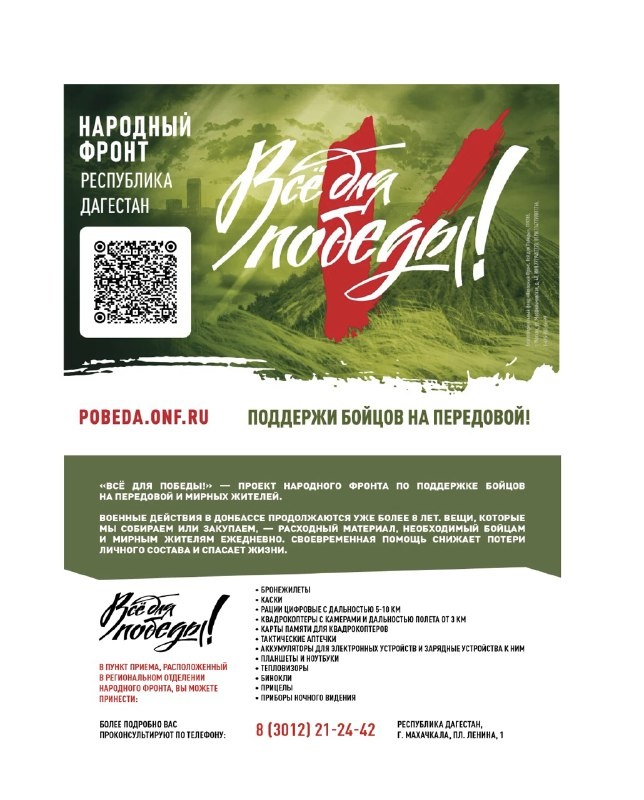2. Принести закупленное снаряжение, обмундирование или другую гуманитарную помощь непосредственно в региональный штаб по адресу г. Махачкала, пл. Ленина, 1 (здание министерства по национальной политике и делам религий РД, 1 этаж), тел. 51-40-44.