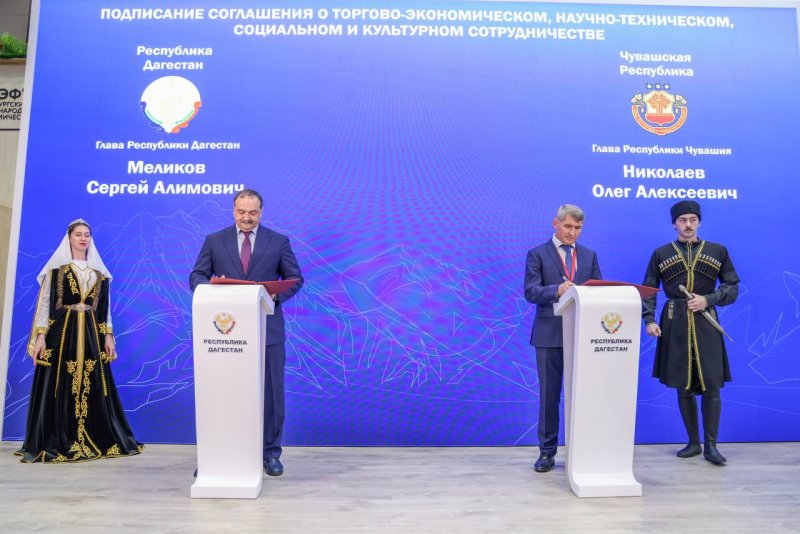 15 июня, на площадке дагестанского стенда глава региона Сергей Меликов подписал соглашение о сотрудничестве с Главой Чувашской Республики Олегом Николаевым.