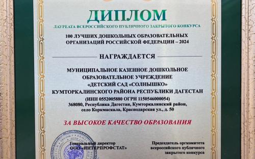 По результатам участия во Всероссийском публичном закрытом конкурсе «Лучшие учреждения/организации Российской Федерации» Коркмаскалинский детский сад «Солнышко» включен в 100 лучших дошкольных образовательных организаций России 2024 года! Детский сад награжден дипломом лауреата за высокое качество образования.