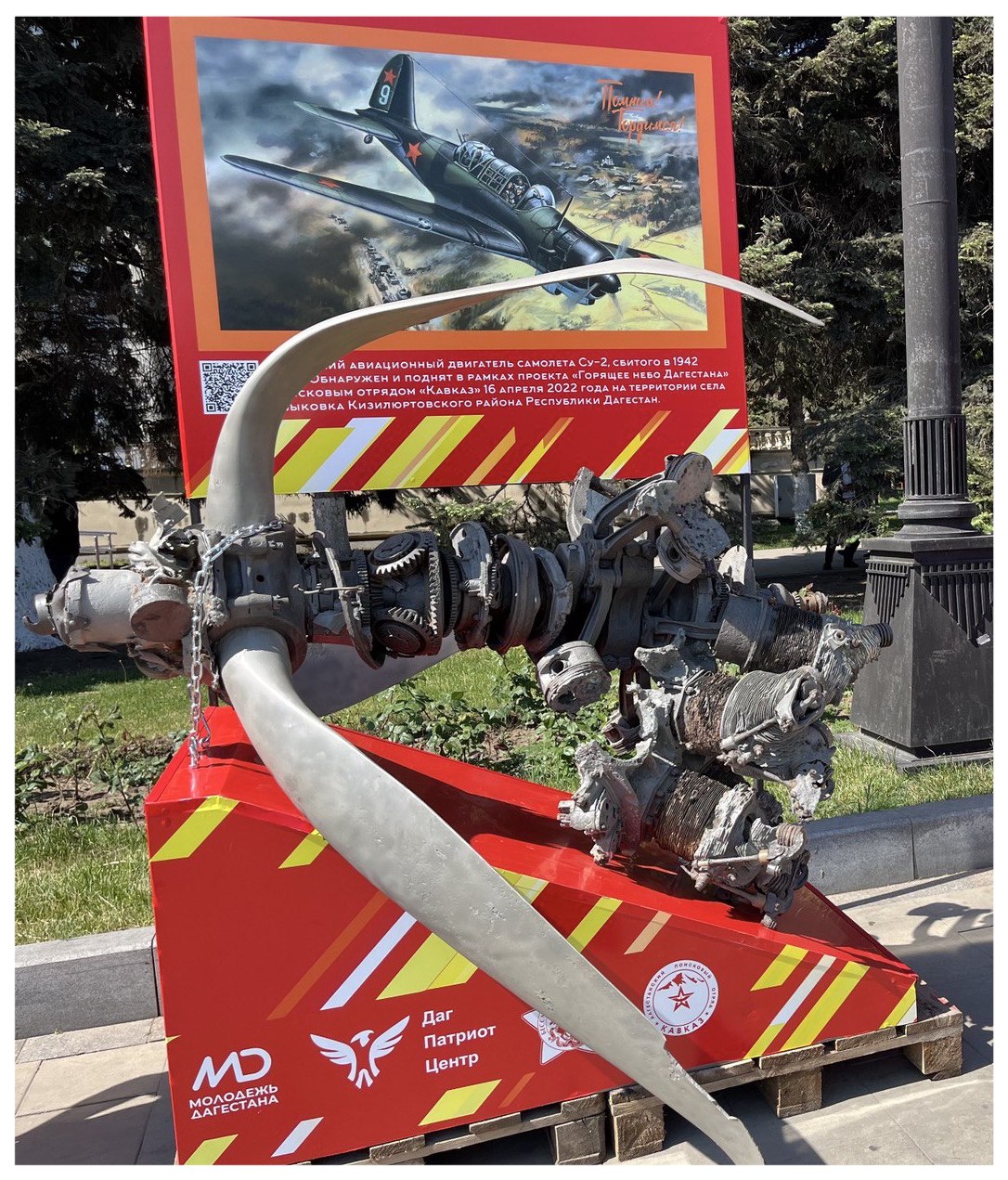 На площади Ленина в Махачкале выставлены останки авиационного двигателя, найденного в Кизилюртовском районе в 2022 году. Стенд сообщает, что это был самолёт СУ-2, сбитый в 1942 году.