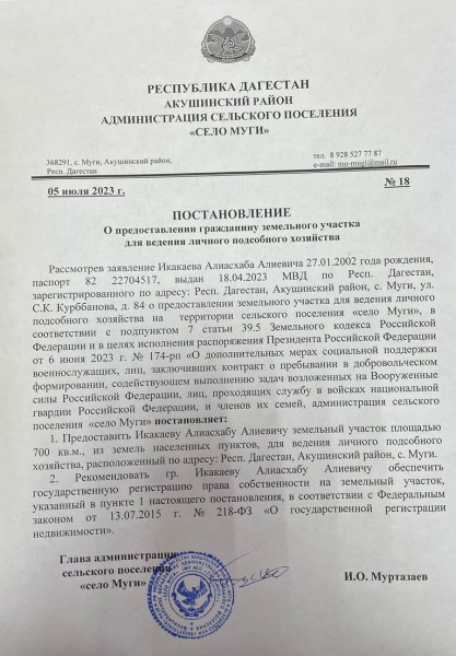 Сегодня, 6 июля, глава администрации МО СП «село Муги» Акушинского района Ислам Муртазаев, в рамках реализации мер поддержки участников СВО и членов их семей вручил постановление о выделении земельного участка площадью 700 кв. метров для ведения личного подсобного хозяйства мобилизованному участнику СВО Алиасхабу Икакаеву.