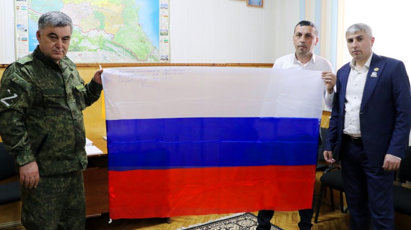 В завершение встречи, военком Кайтага со словами благодарности вручил Магомеду флаг Российской Федерации с личной росписью, который будет водружен кайтагским добровольцем на одном из зданий освобожденных территорий.
