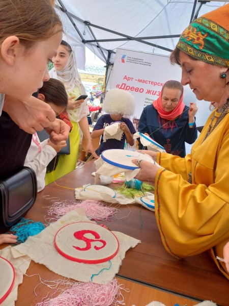 На прошедшем в Дахадаевском районе Всероссийском фестивале «Кубачи», в рамках проекта Арт-мастерская «Древо жизни», победителя конкурса проектов на Грант ПФКИ, мастерицы этноцентра «Кайтаги» провели мастер-класс «Золотая нить поколений».