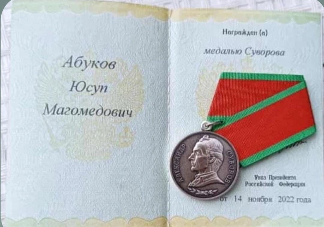 Участвующий в специальной военной операции на территории Украины военнослужащий из с.Калининаул Юсуп Абуков удостоен медали Суворова.