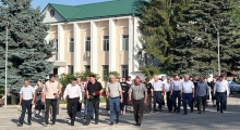 Жители Новолакского района возлагают цветы к памятнику павшим сотрудникам полиции в память о жертвах теракта 23 июня в Дагестане и Севастополе