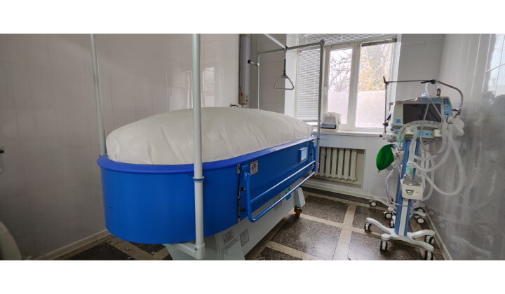 Медоборудование российского производства. Наполнена специализированная кровать кварцевым песком. Она устроена так, что песок нагревается до нужной температуры, а потом приводится в движение воздушным потоком. Пациент на такой кровати, будто плывет по воде. Медоборудование обладает и обеззараживающим эффектом. В итоге раны больного быстрее затягиваются, уменьшаются боли, и он активнее идет на поправку.