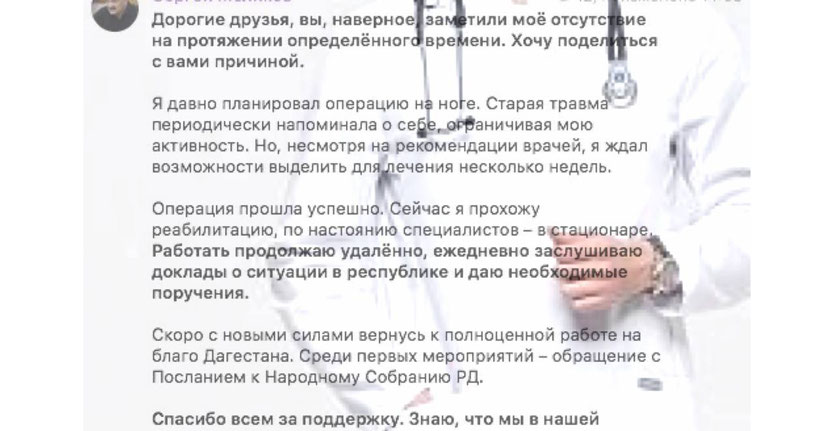 26 апреля глава Дагестана Сергей Меликов опубликовал пост в тг-кале с объяснением своей плановой диспансеризации с 10 апреля.
