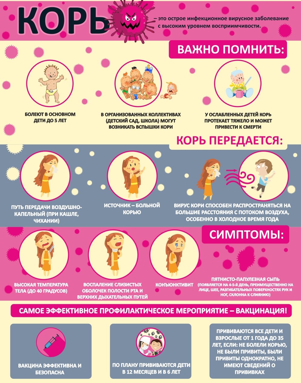 срочно обратиться за медицинской помощью (вызвать врача из поликлиники или в случае тяжелого состояния вызвать скорую медицинскую помощь); не посещать поликлинику самостоятельно, а дождаться врача; до прихода врача свести контакты с родственниками до минимума; при кашле и чихании прикрывать рот и нос, используя носовой платок или салфетку; чаще мыть руки водой с мылом или использовать спиртосодержащие средства для очистки рук; использовать средства защиты органов дыхания (например, маску или марлевую повязку).О том, что существует такая болезнь как корь, многие уже успели подзабыть. Но ситуация изменилась. По данным управления Роспотребнадзора на территории Тюменской области зарегистрированы случаи заболевания корью. Следовательно, значительно возрастает вероятность инфицирования не имеющих иммунитета к кори жителей, а также способствует созданию условий для распространения заболевания корью среди населения.