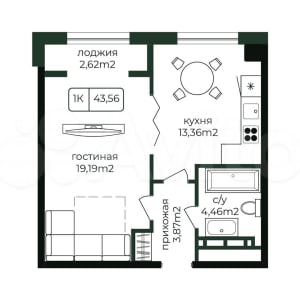 - Общая площадь: 43.6 м²